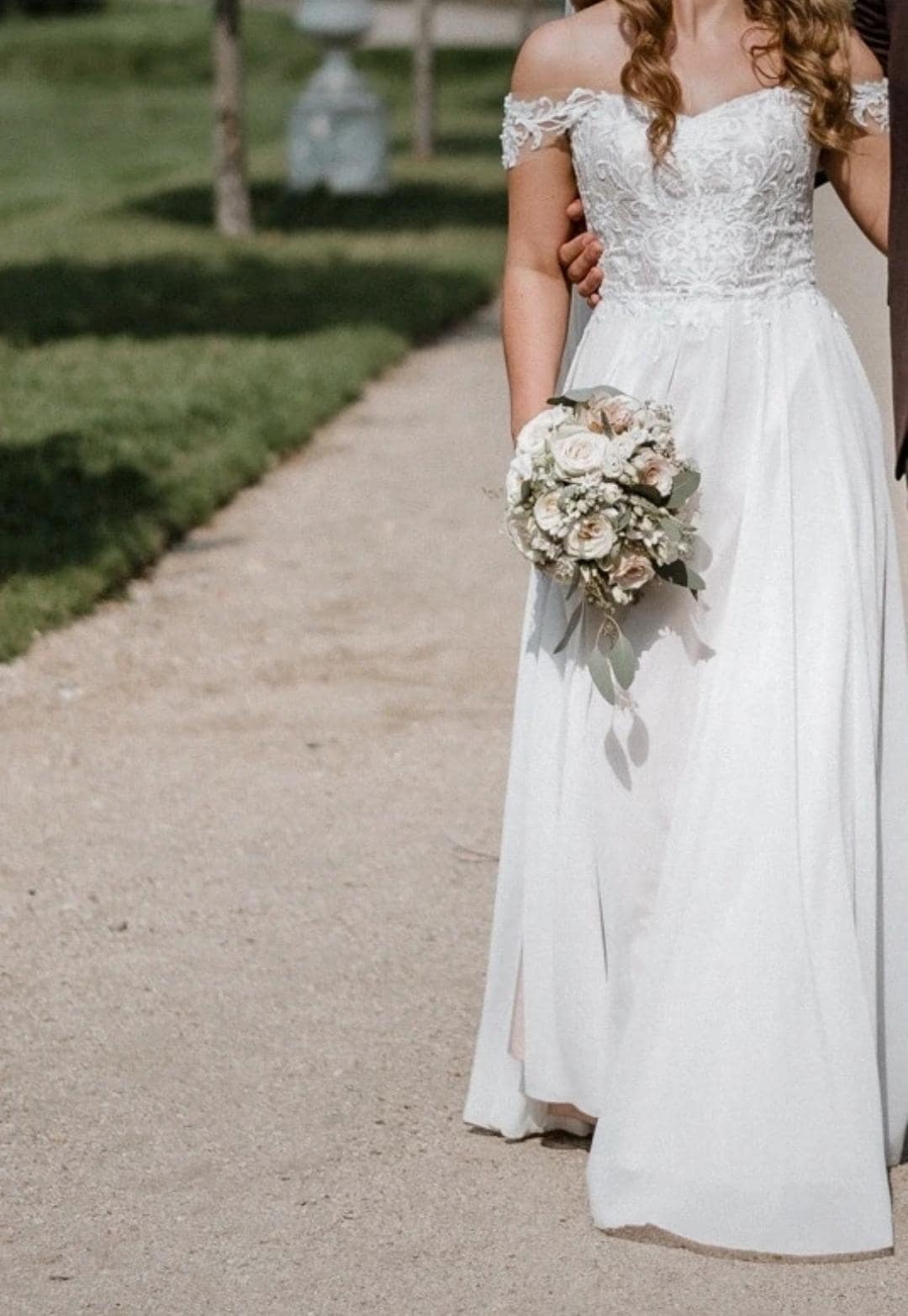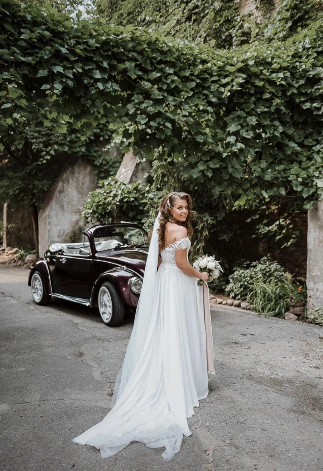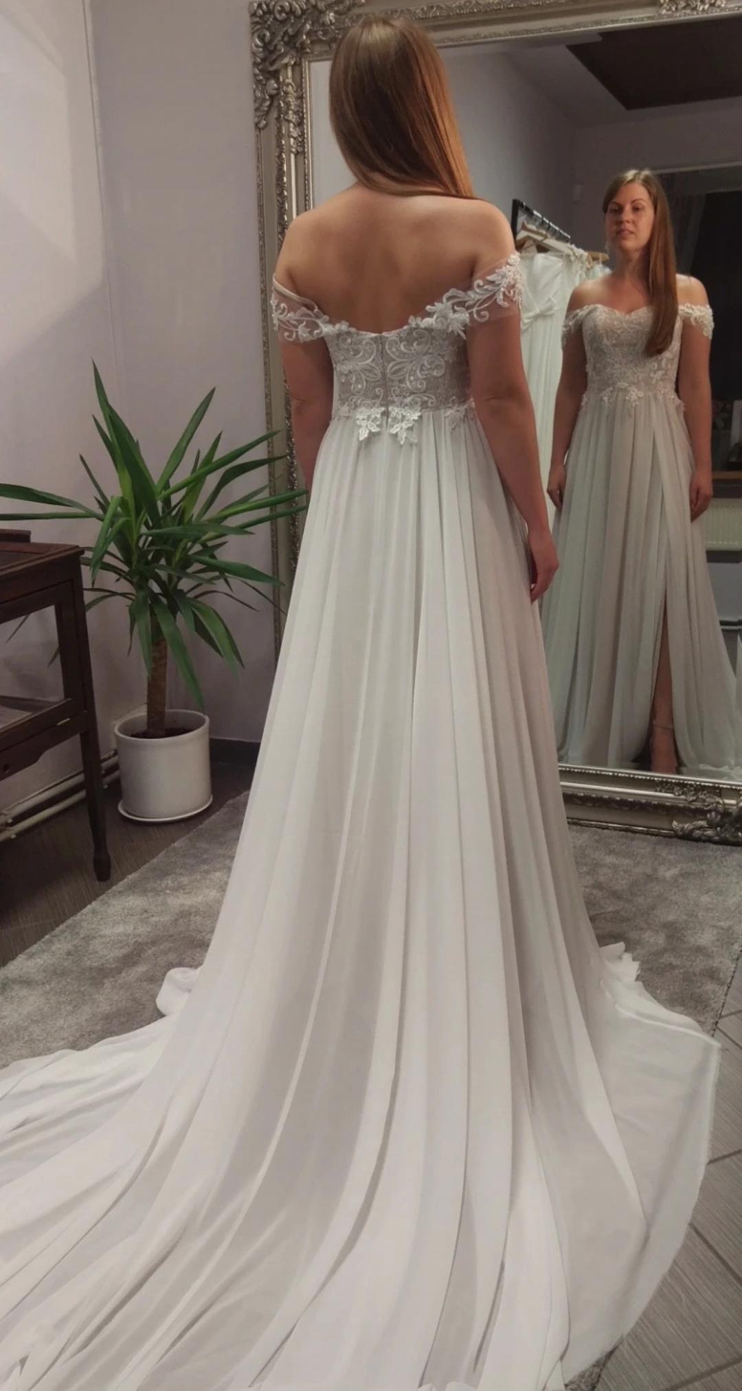 Designer wedding dress by a European designer. Light, flowy and comfortable, with a structured corset top.