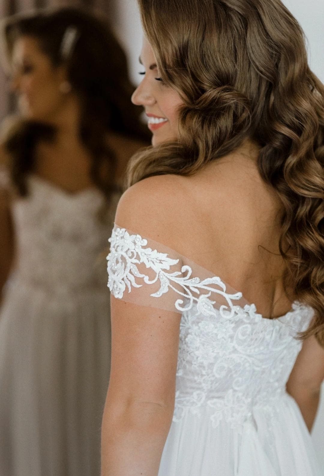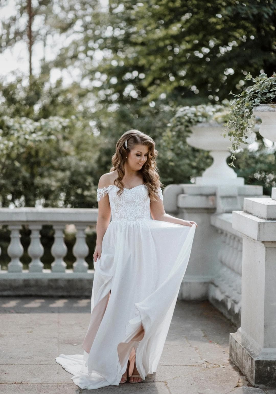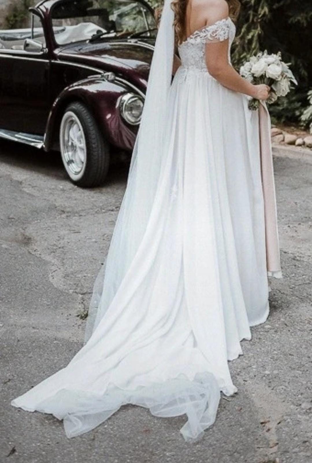 Designer wedding dress by a European designer. Light, flowy and comfortable, with a structured corset top.