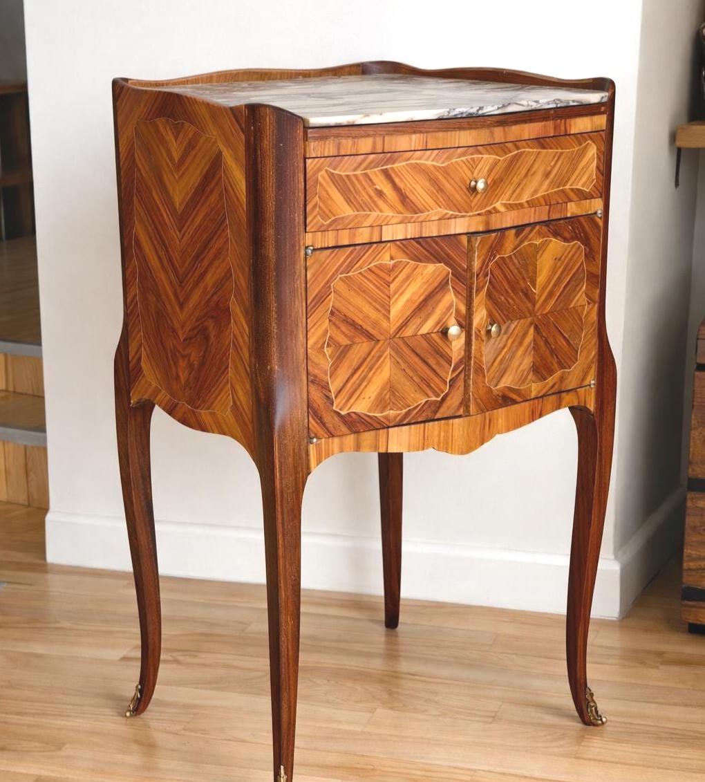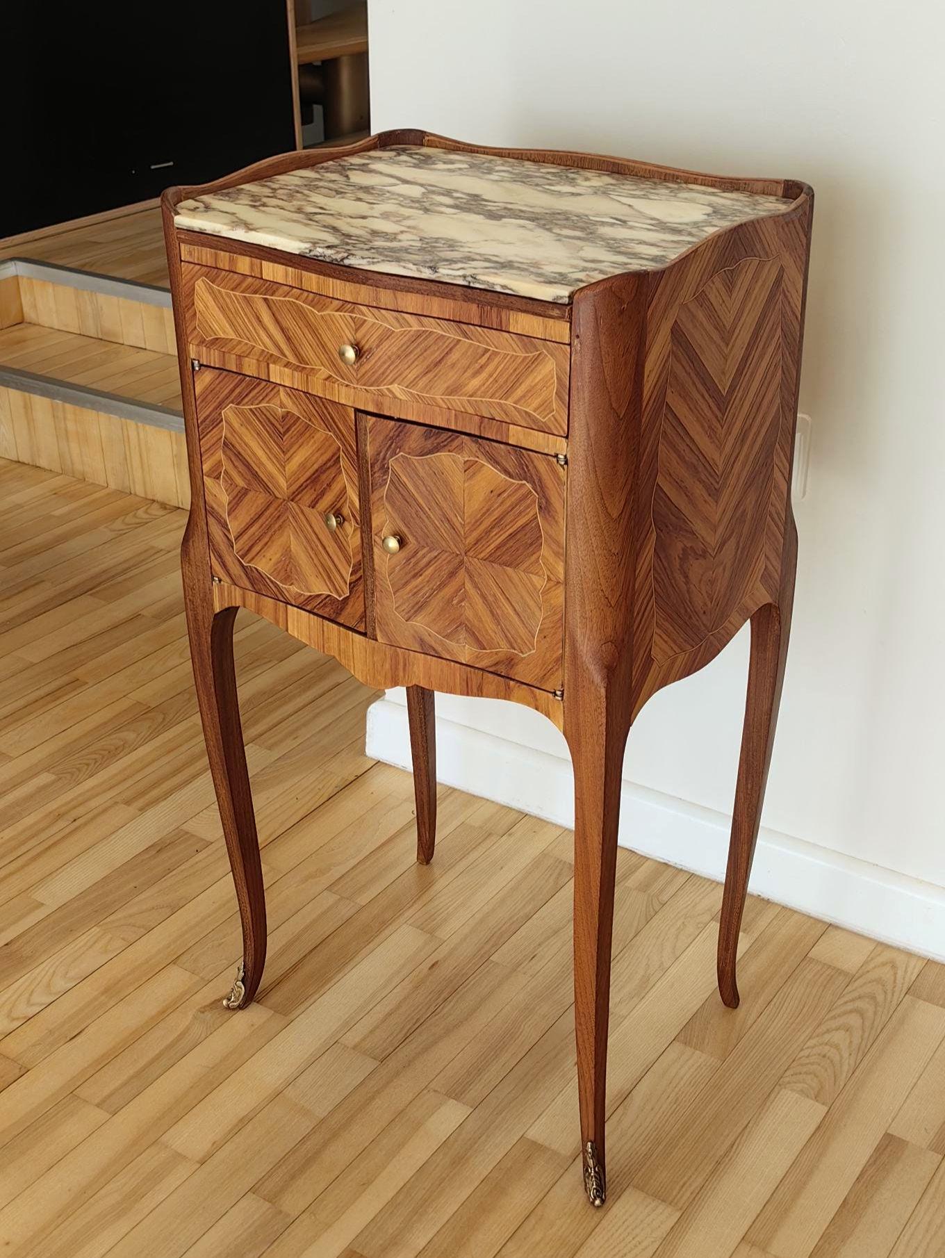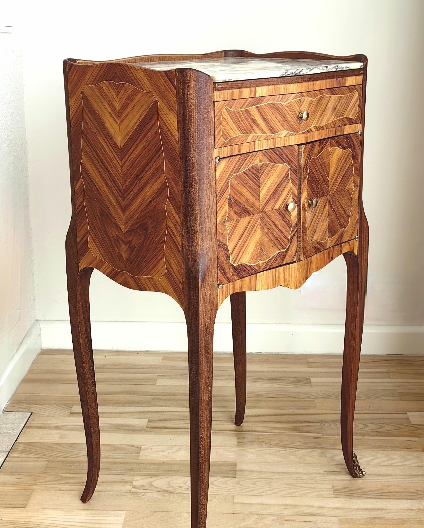 Elegant single restored Louis XV nightstand with marble top. Crafted from walnut wood, this vintage French piece bring timeless charm and sophistication to any interior.