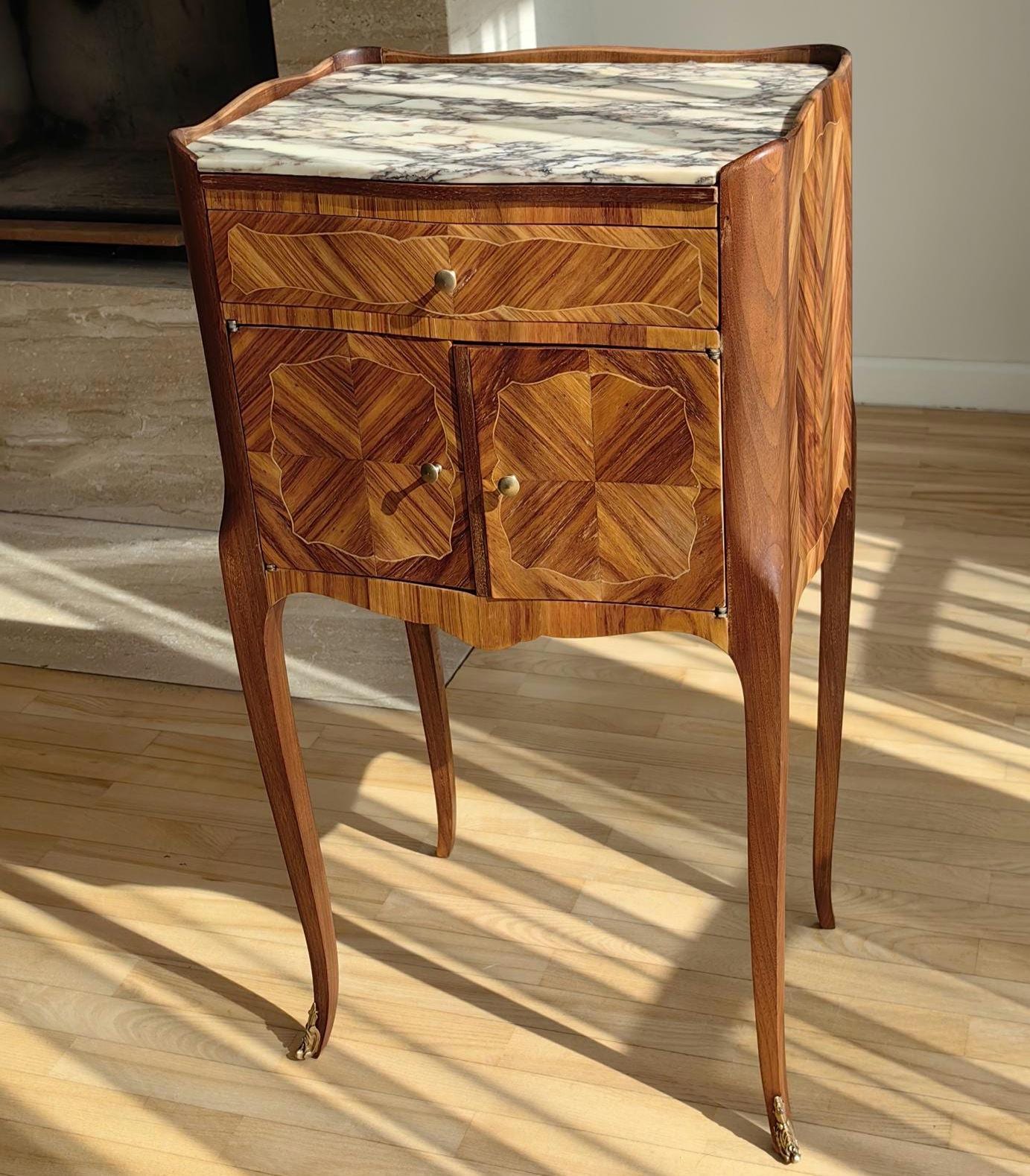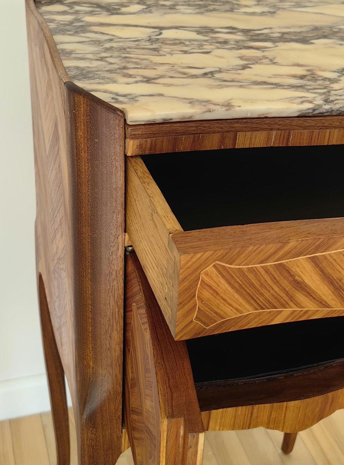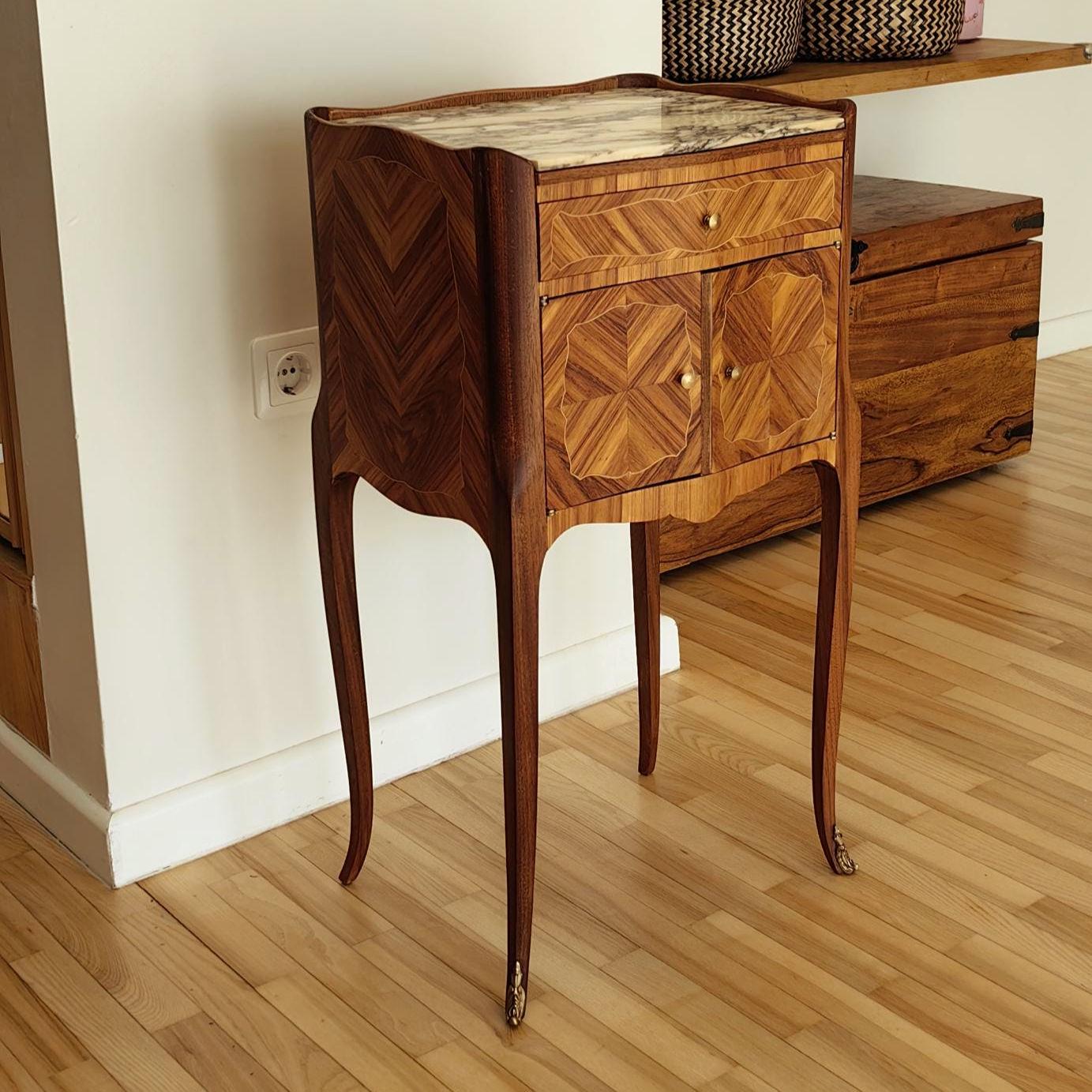 Elegant single restored Louis XV nightstand with marble top. Crafted from walnut wood, this vintage French piece bring timeless charm and sophistication to any interior.