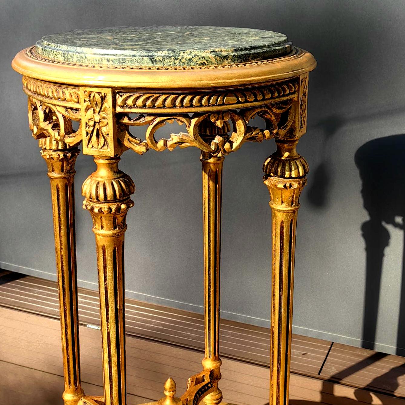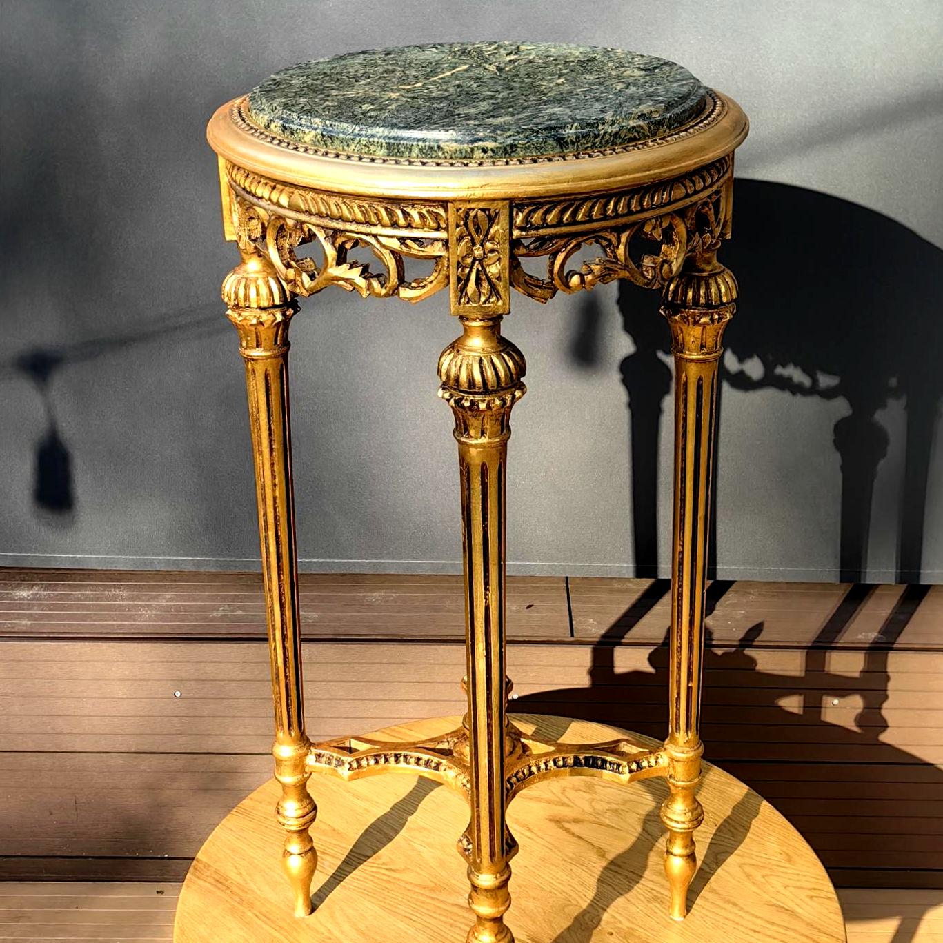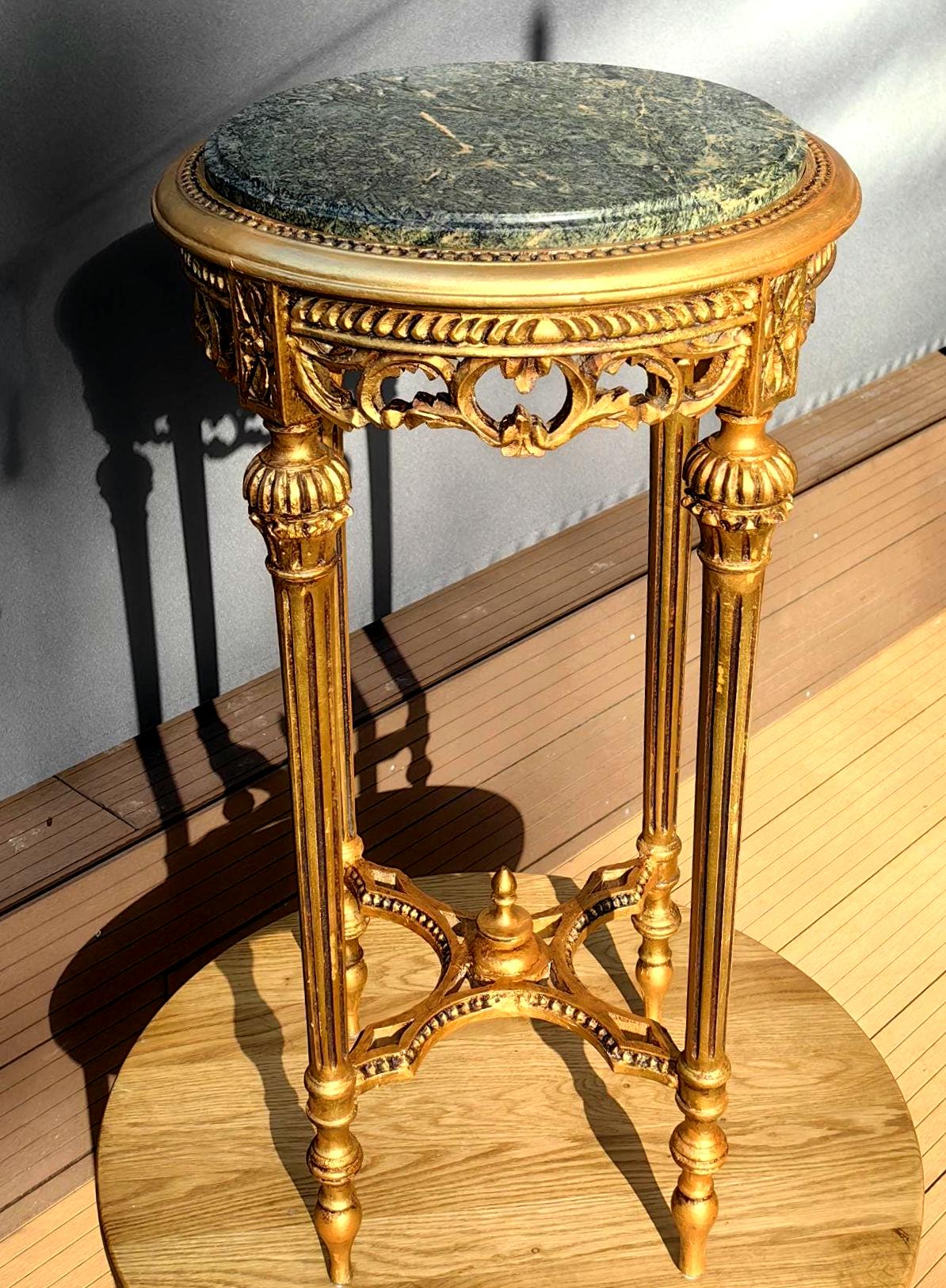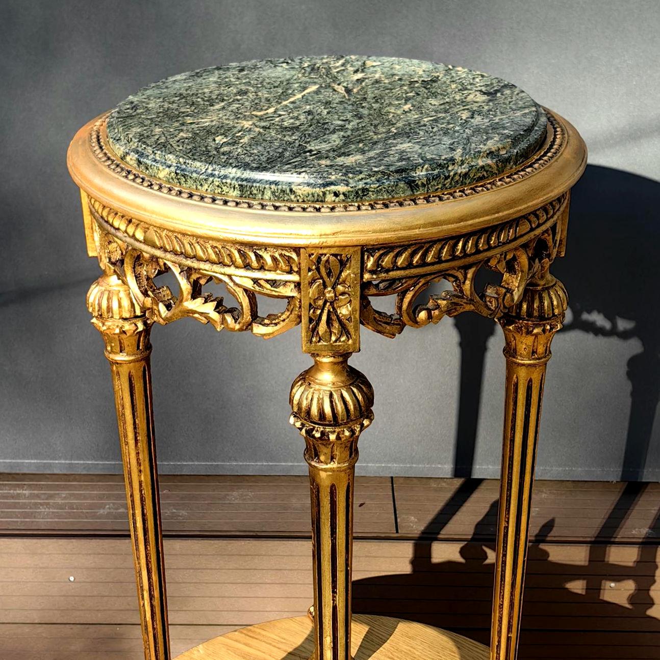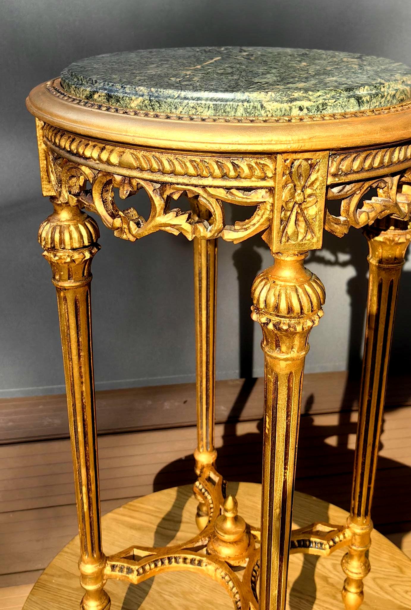 This piece features a beautifully carved gilt wood frame with delicate neoclassical details, paired with a striking green stone top showcasing natural veining.