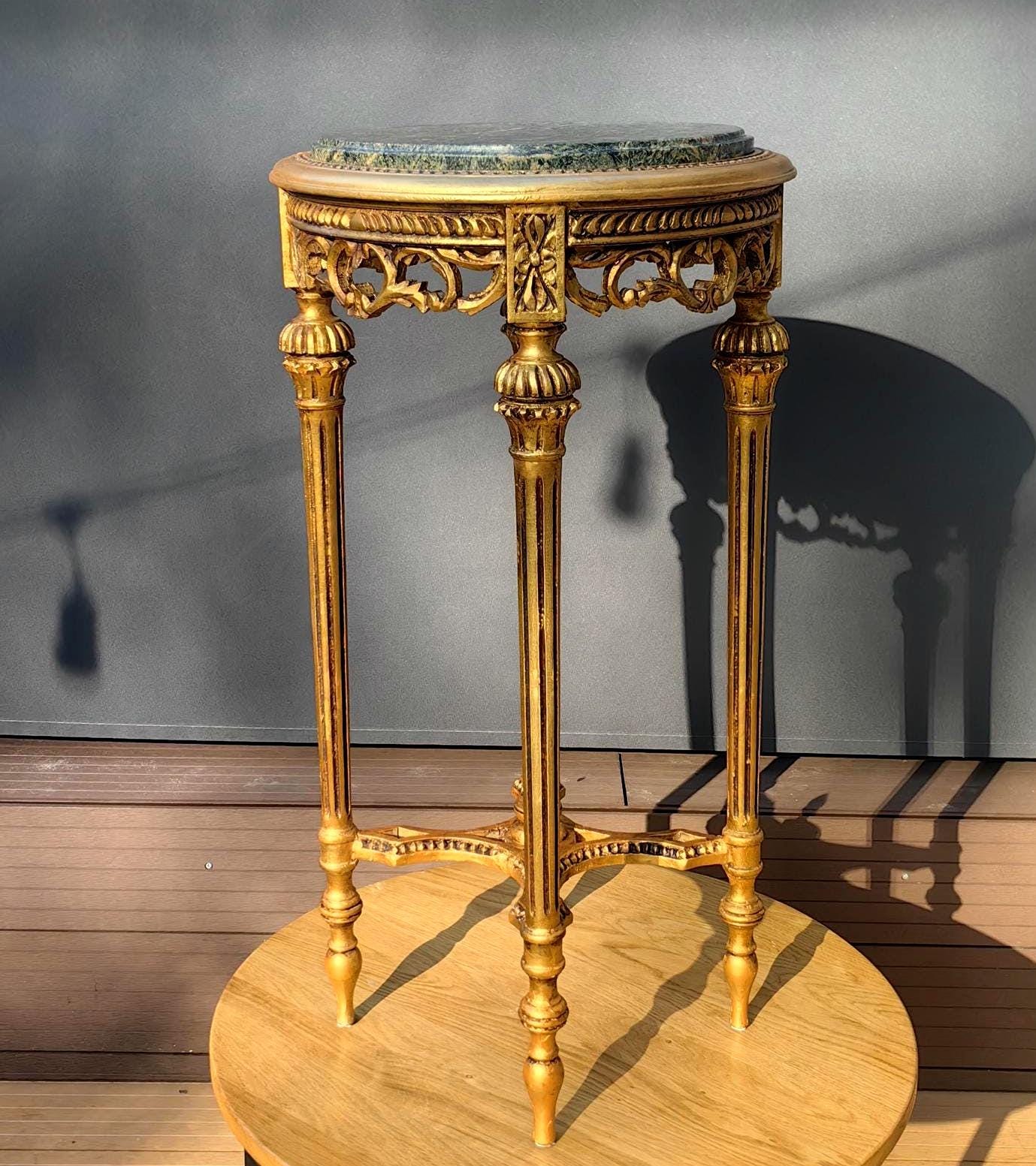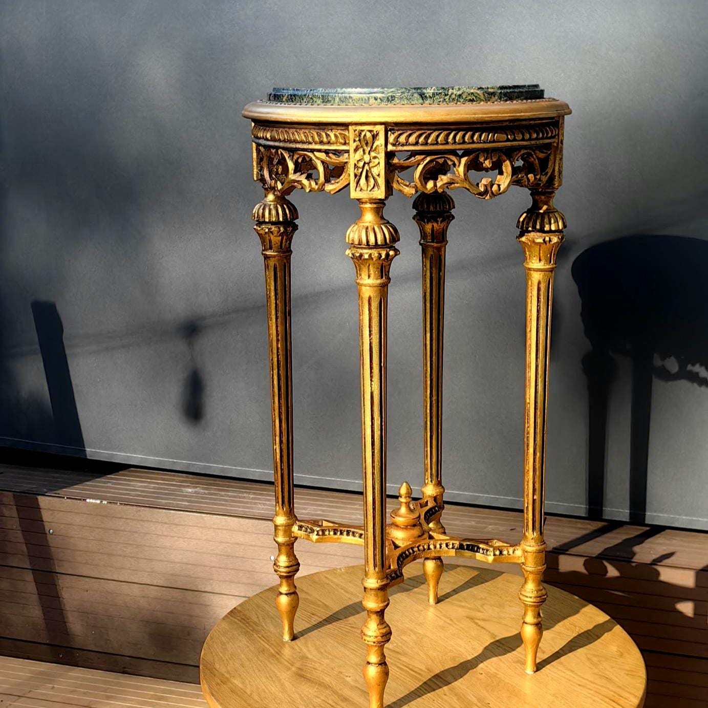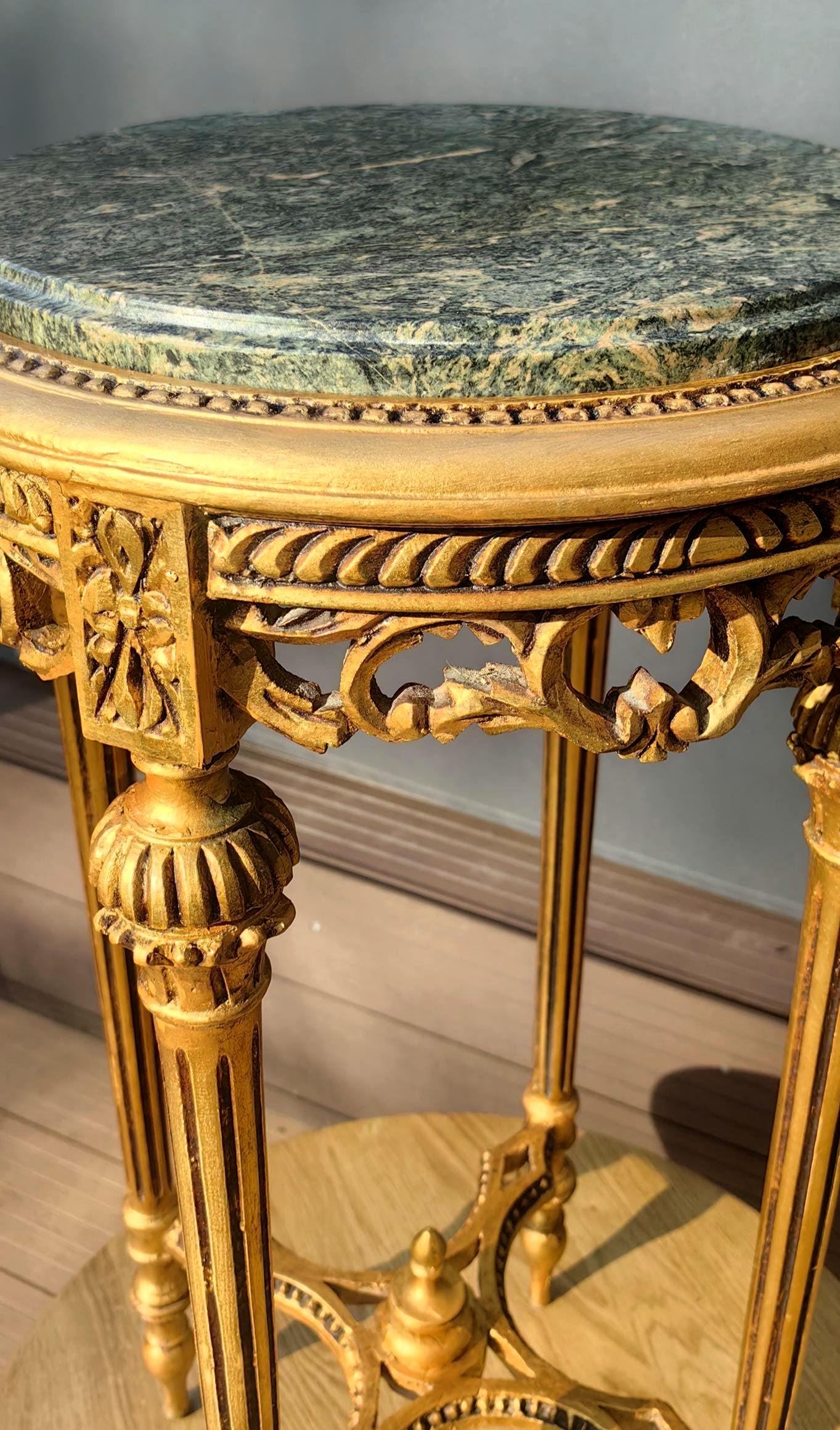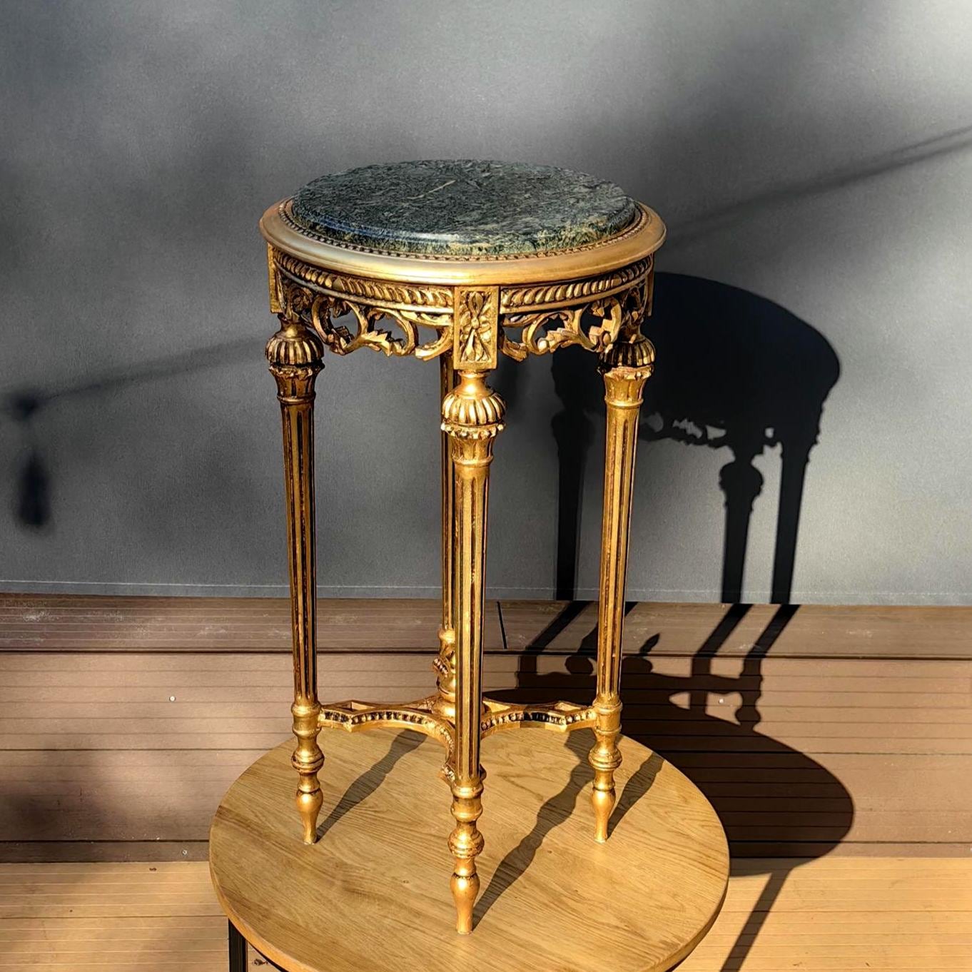 This piece features a beautifully carved gilt wood frame with delicate neoclassical details, paired with a striking green stone top showcasing natural veining.