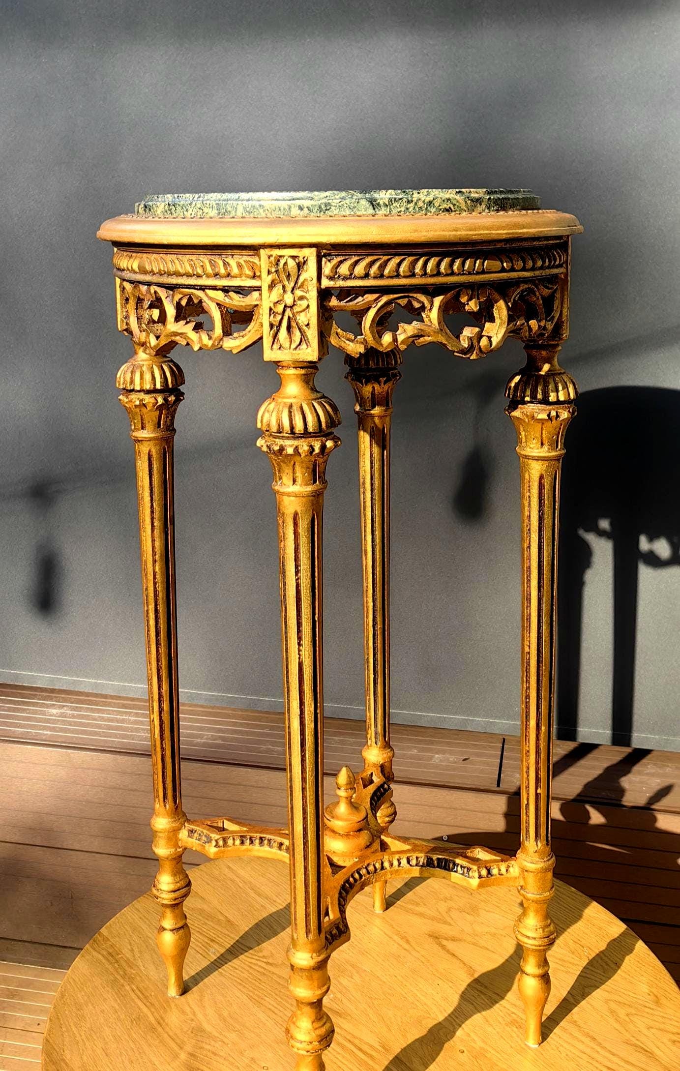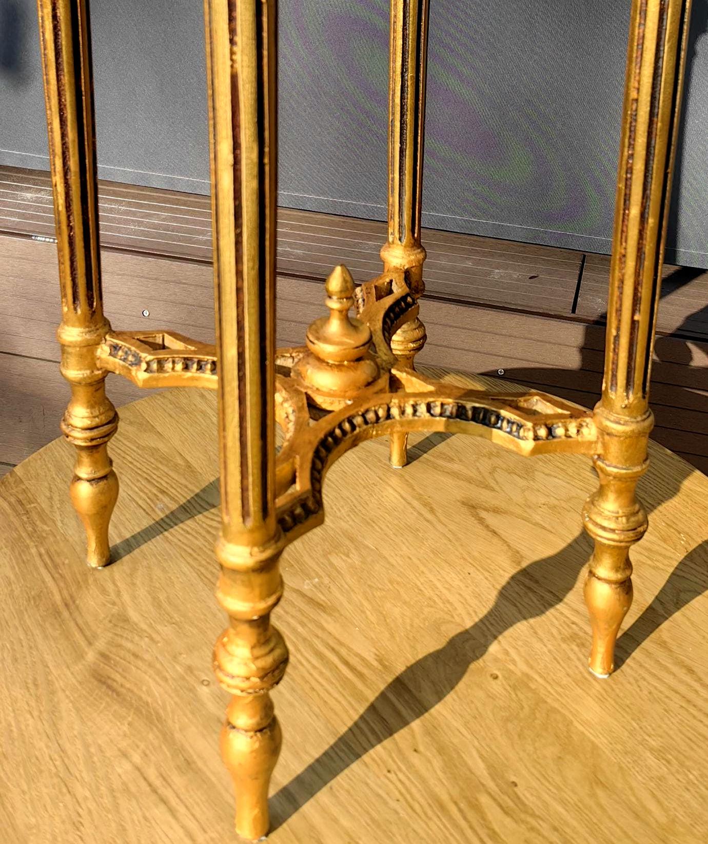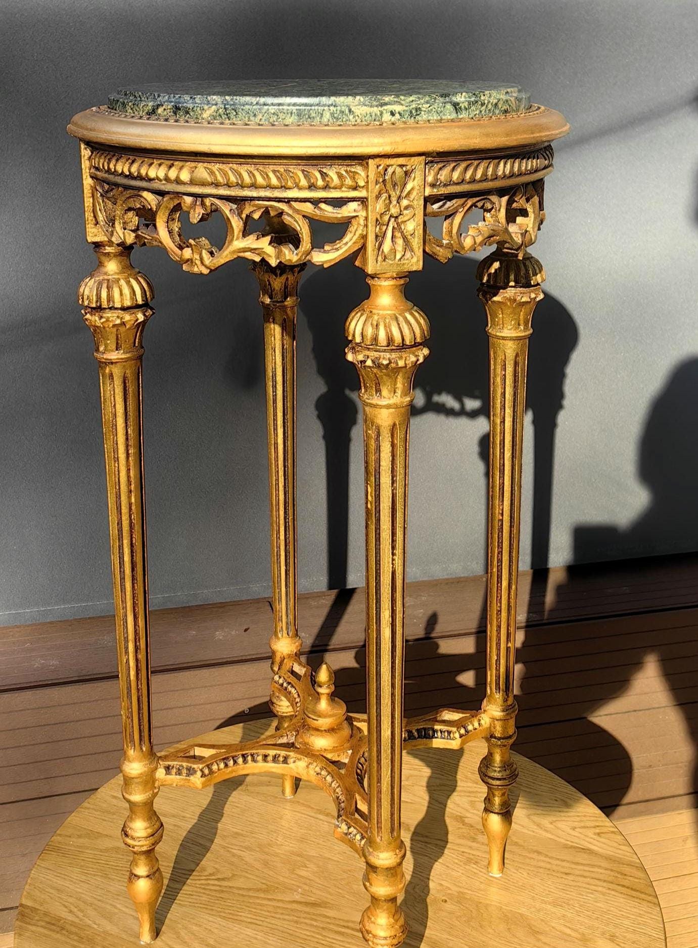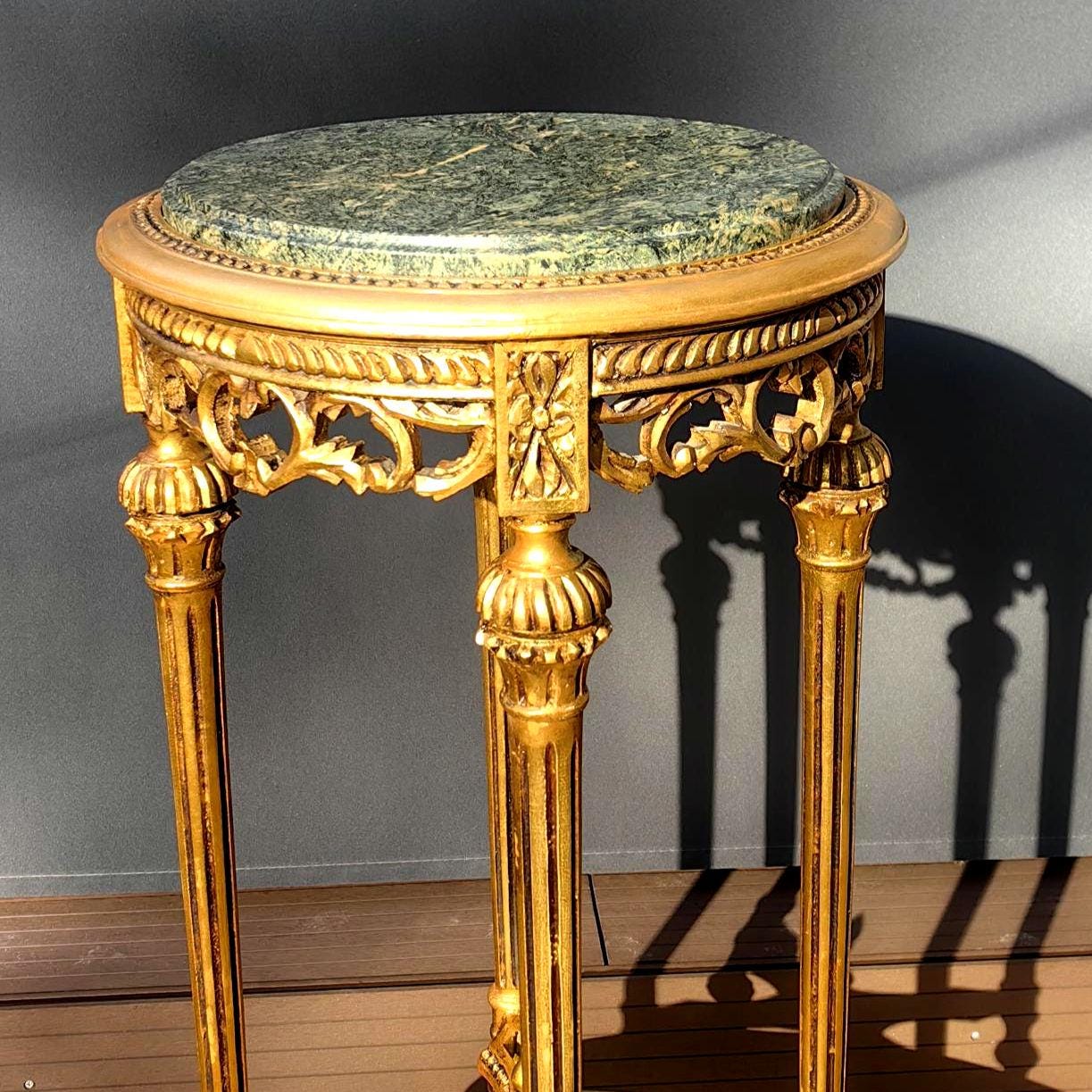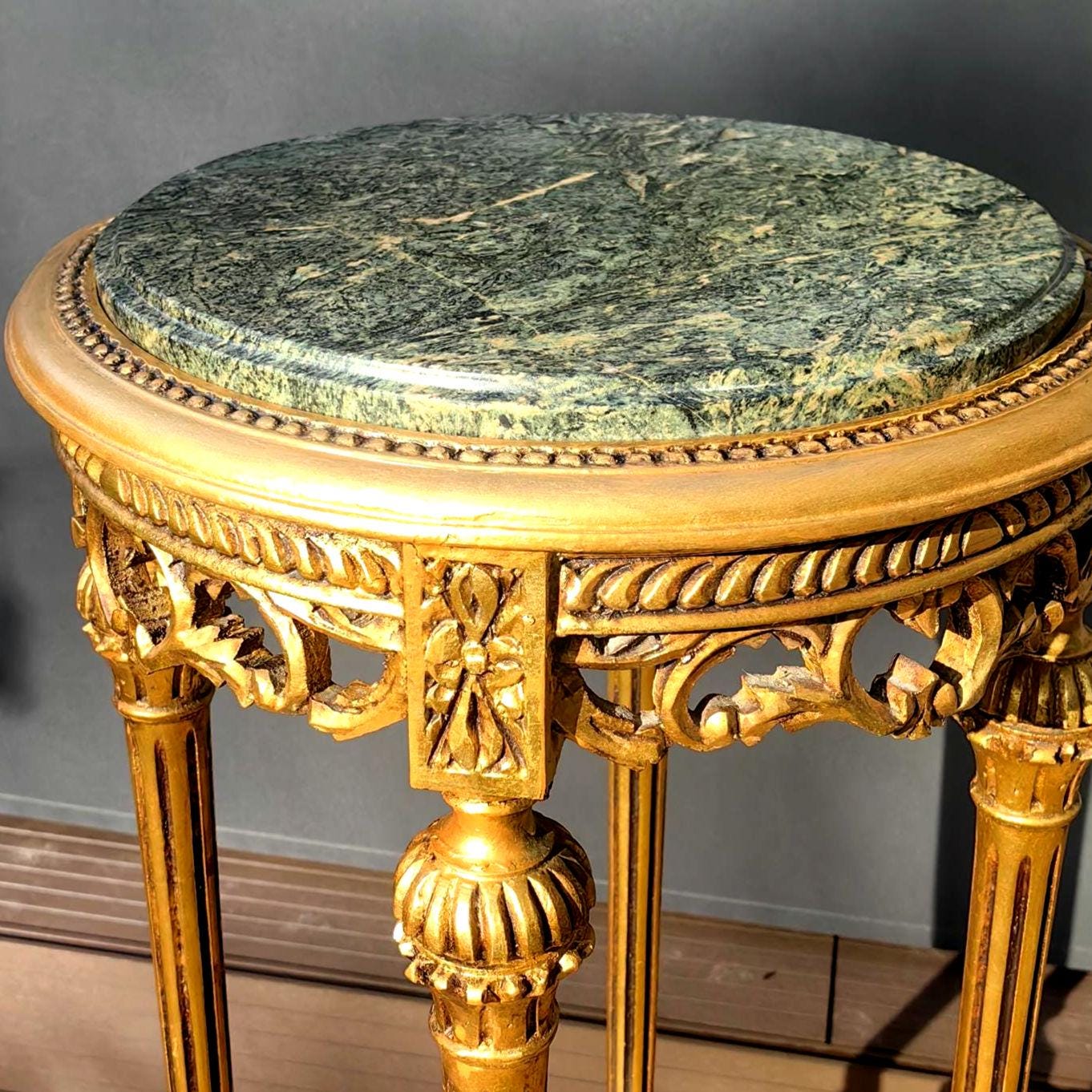This piece features a beautifully carved gilt wood frame with delicate neoclassical details, paired with a striking green stone top showcasing natural veining.