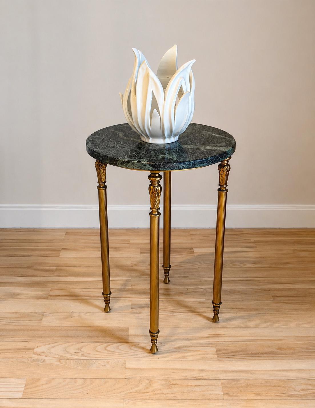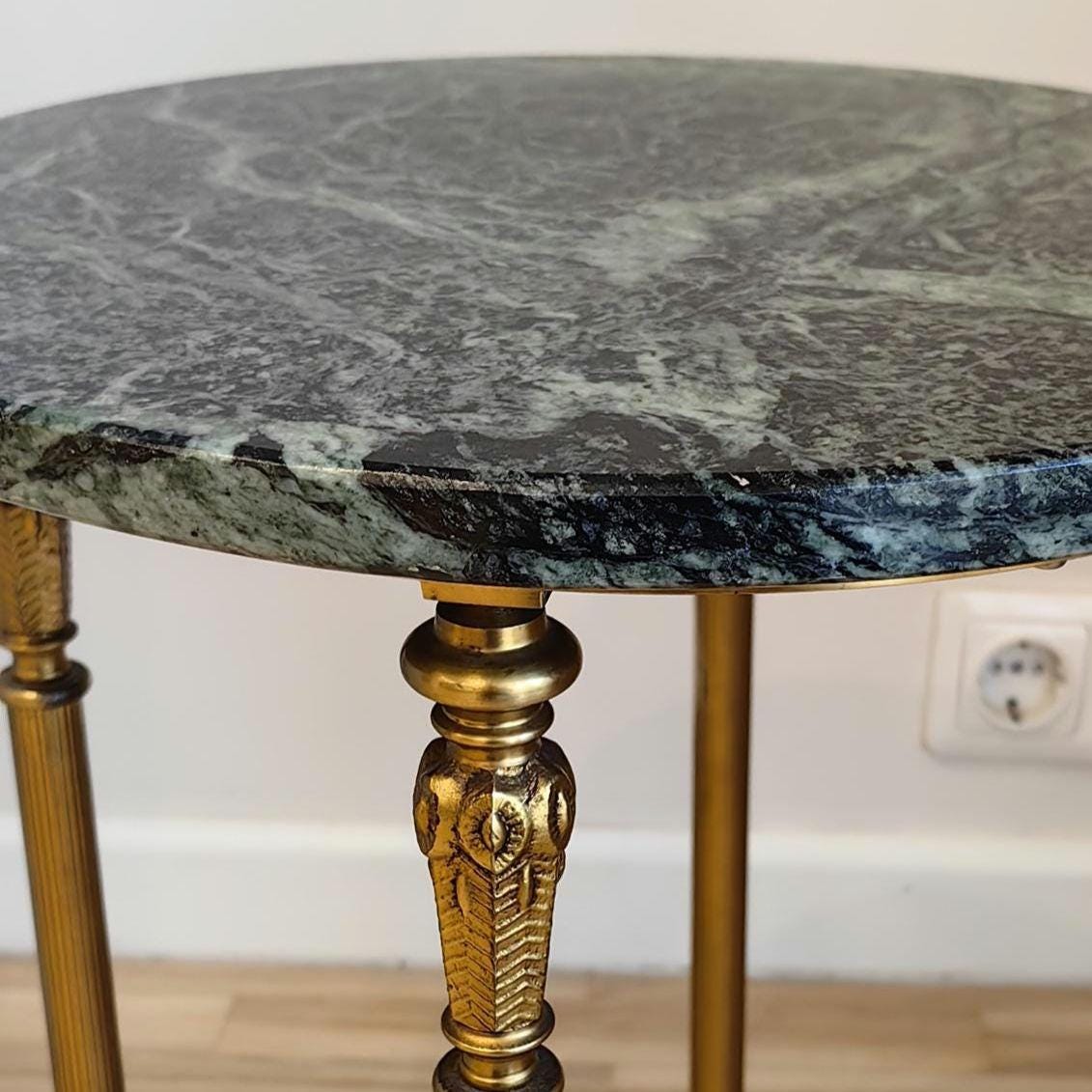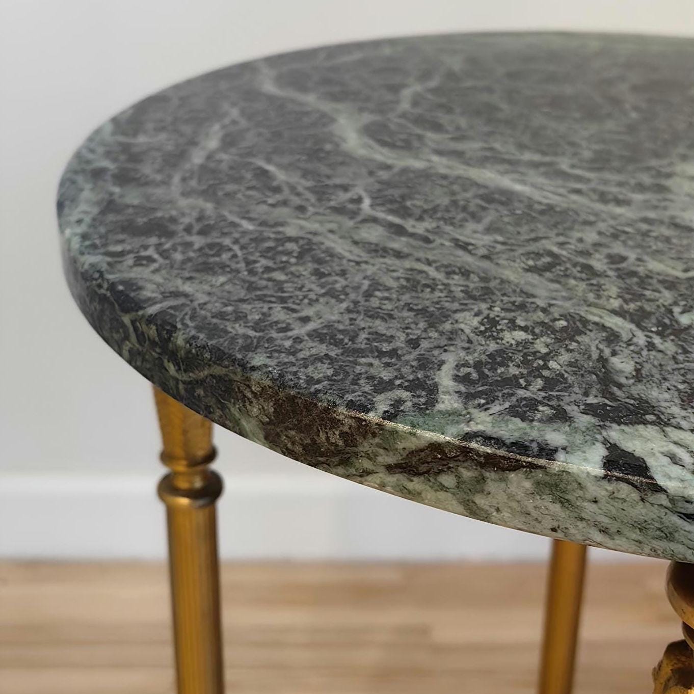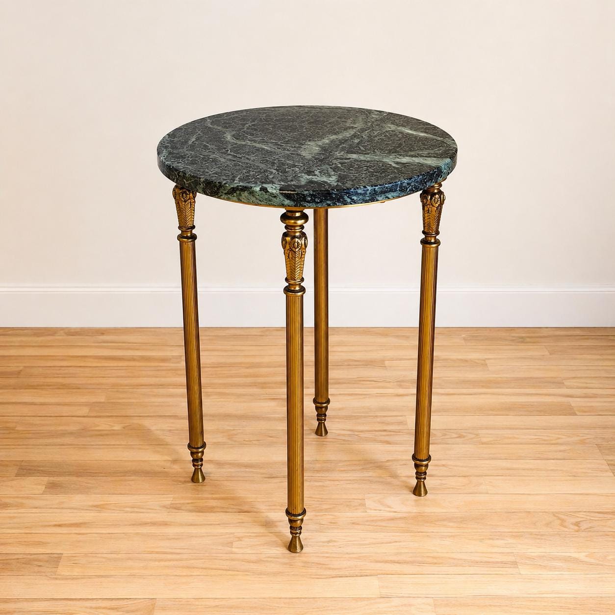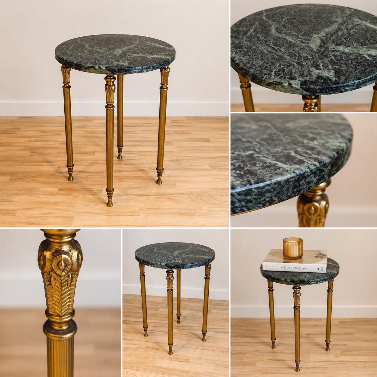 Elegant vintage French side table featuring a beautiful green marble top and refined brass legs.