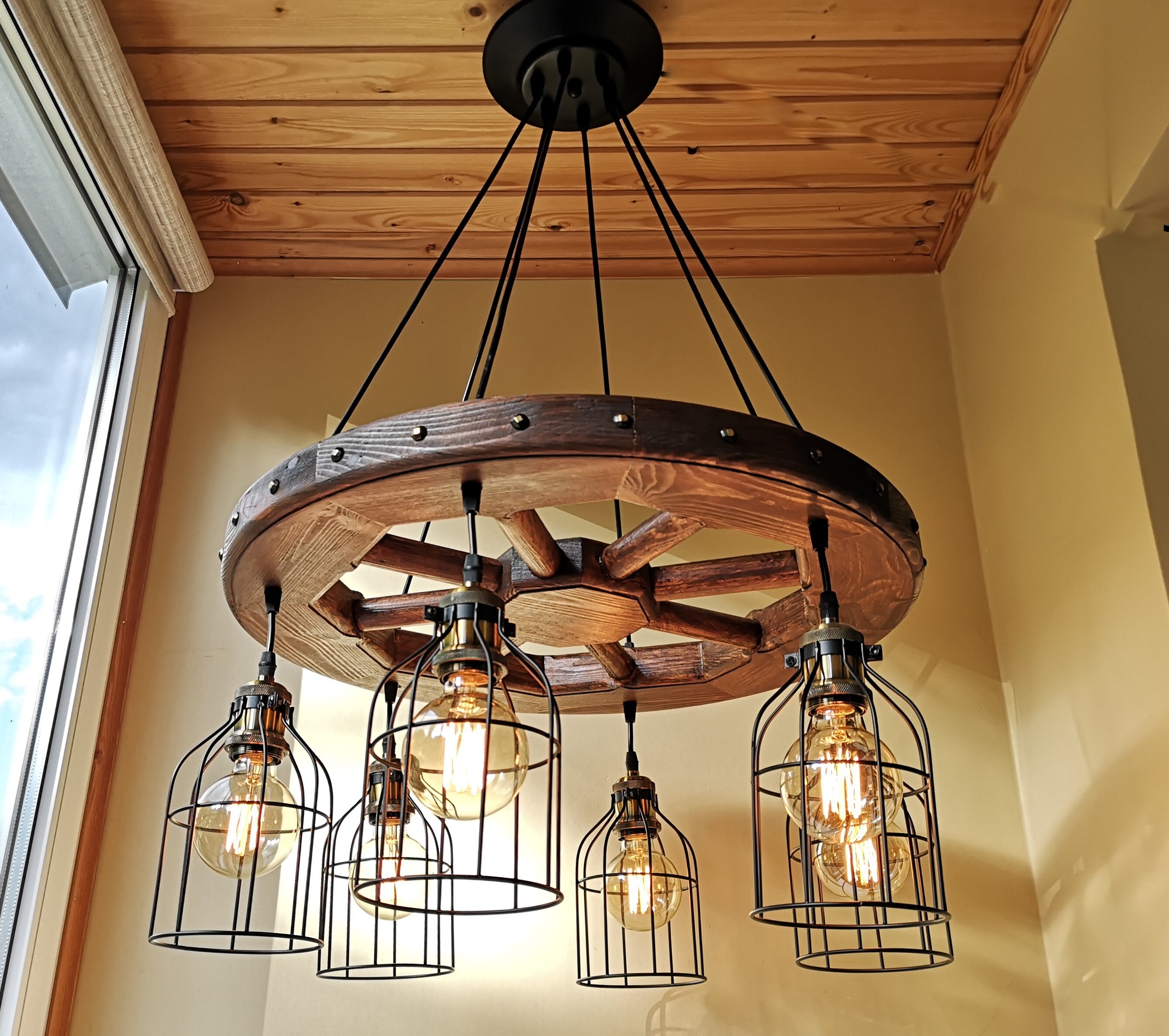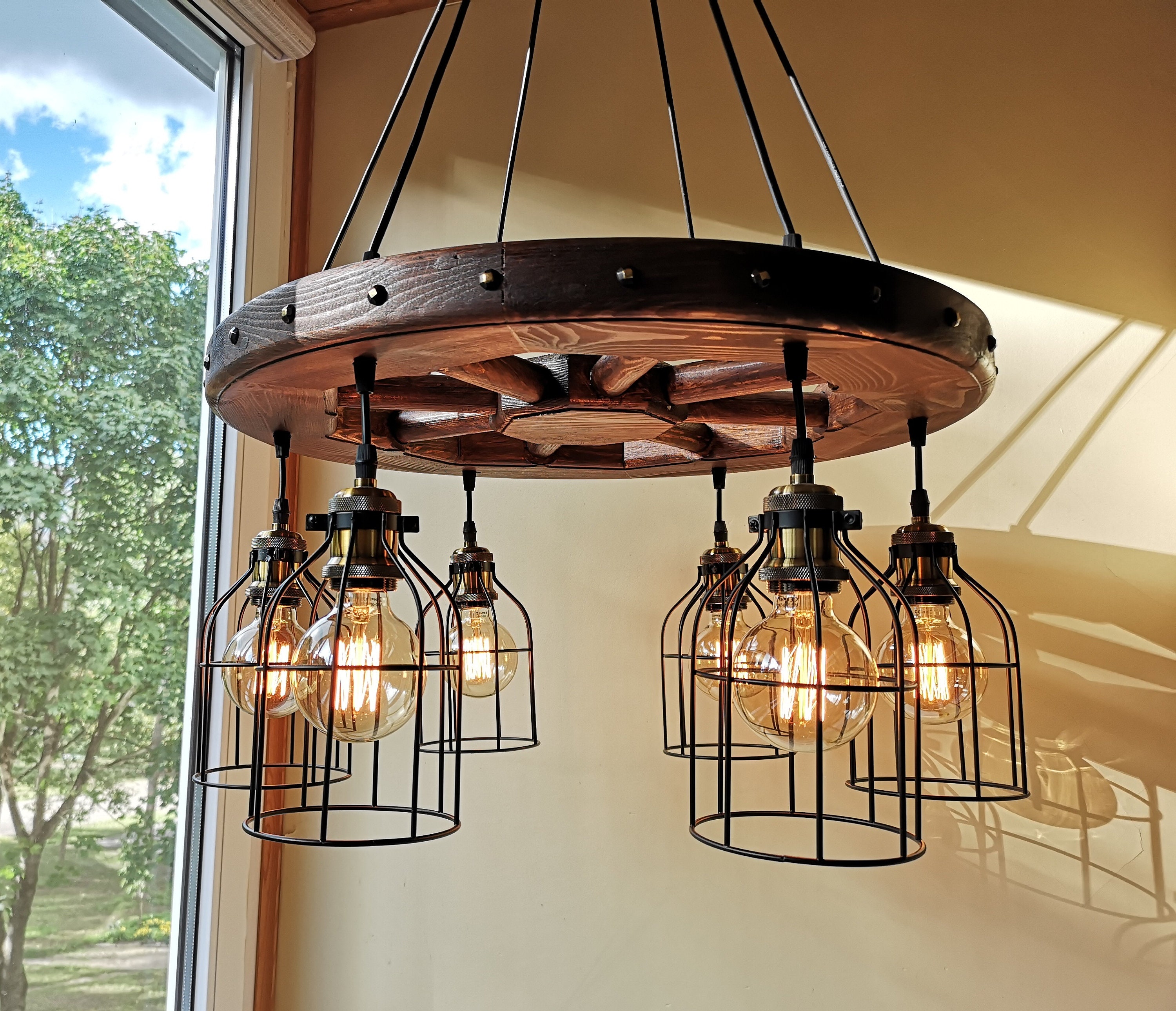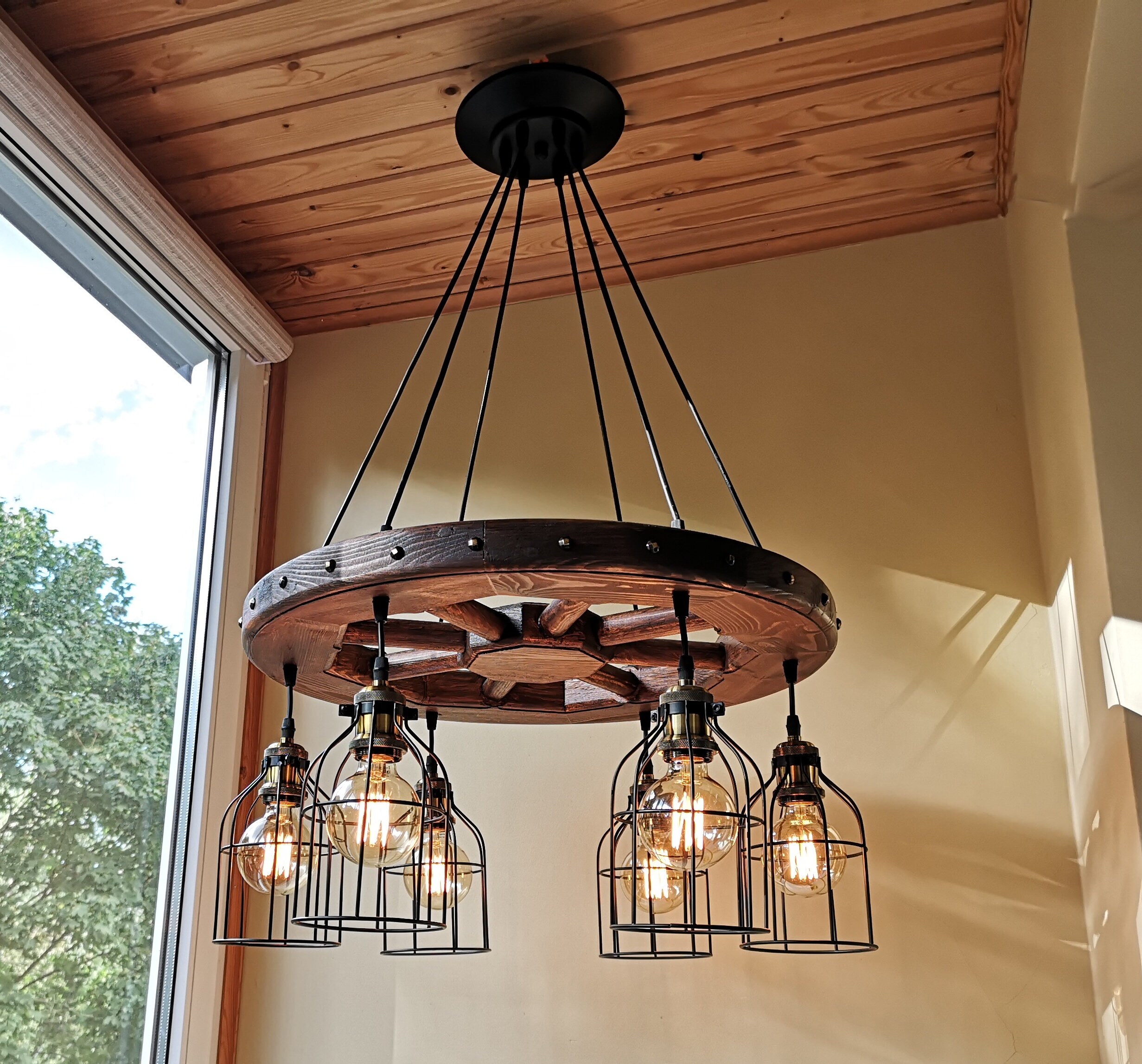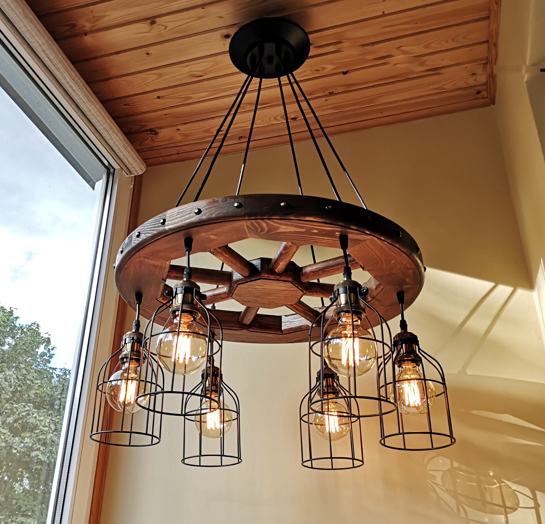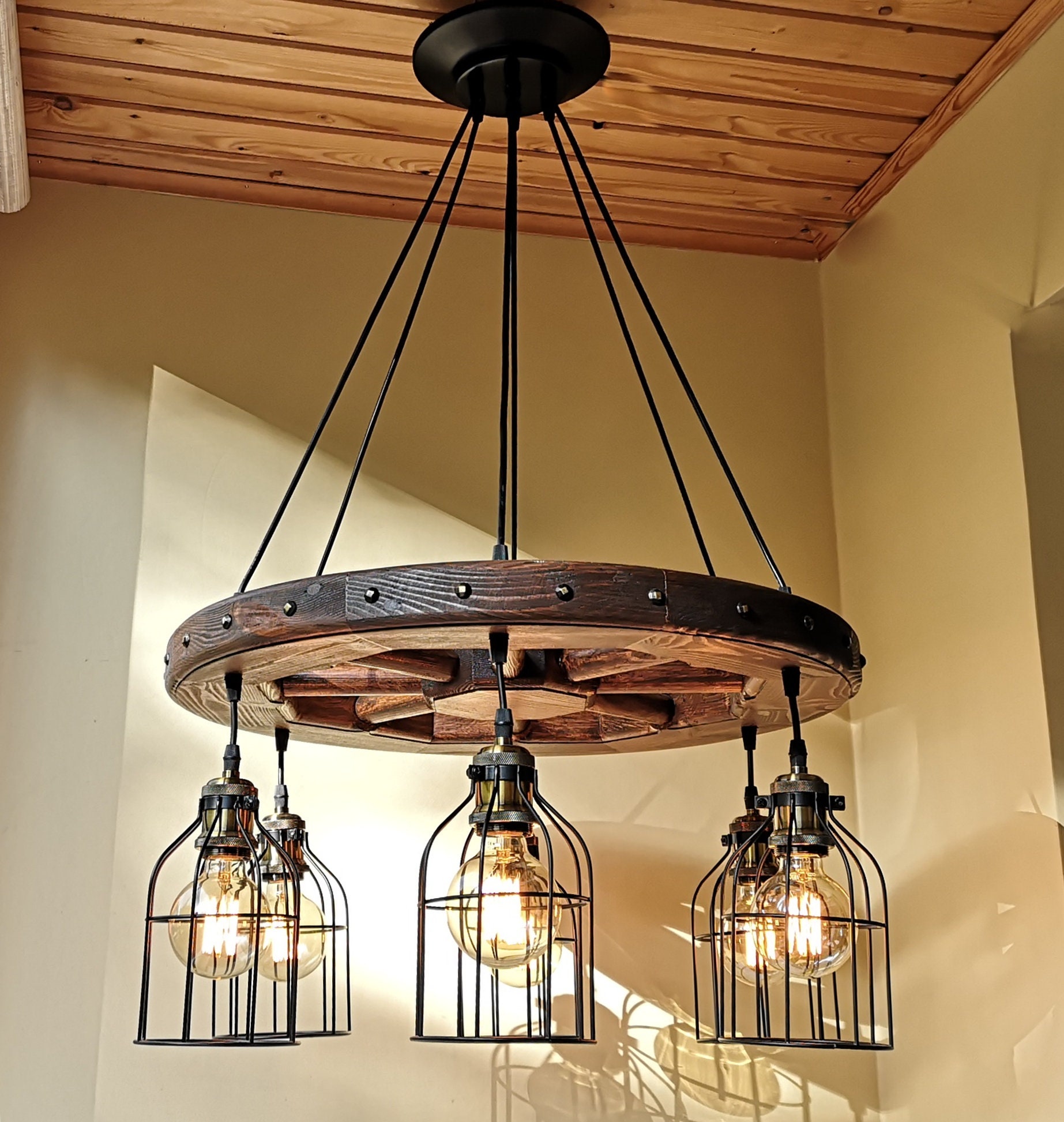 Wagon wheel chandelier - rustic lighting - rustic light fixture - wood ceiling light - dining room lighting - rustic chandelier lighting