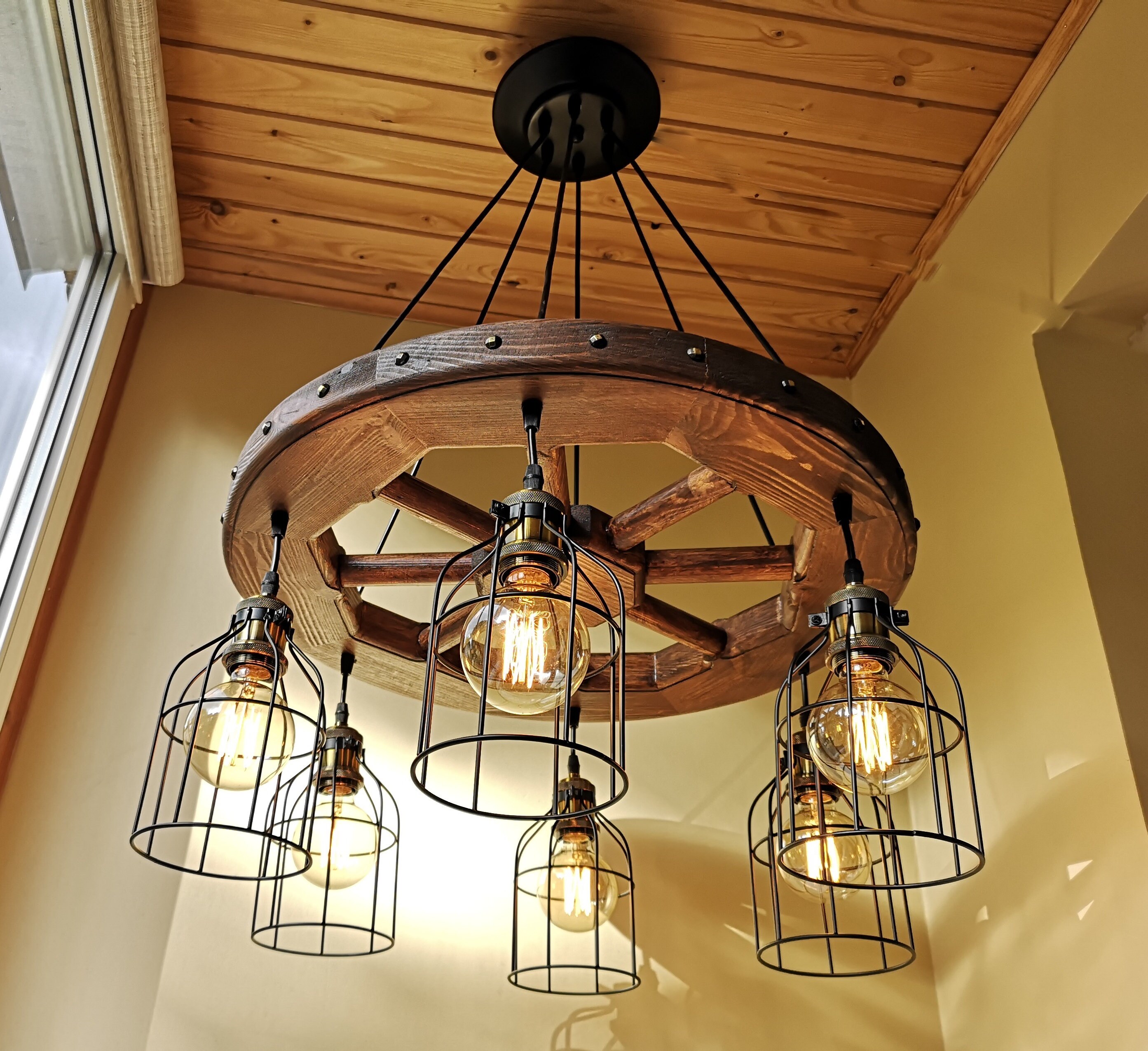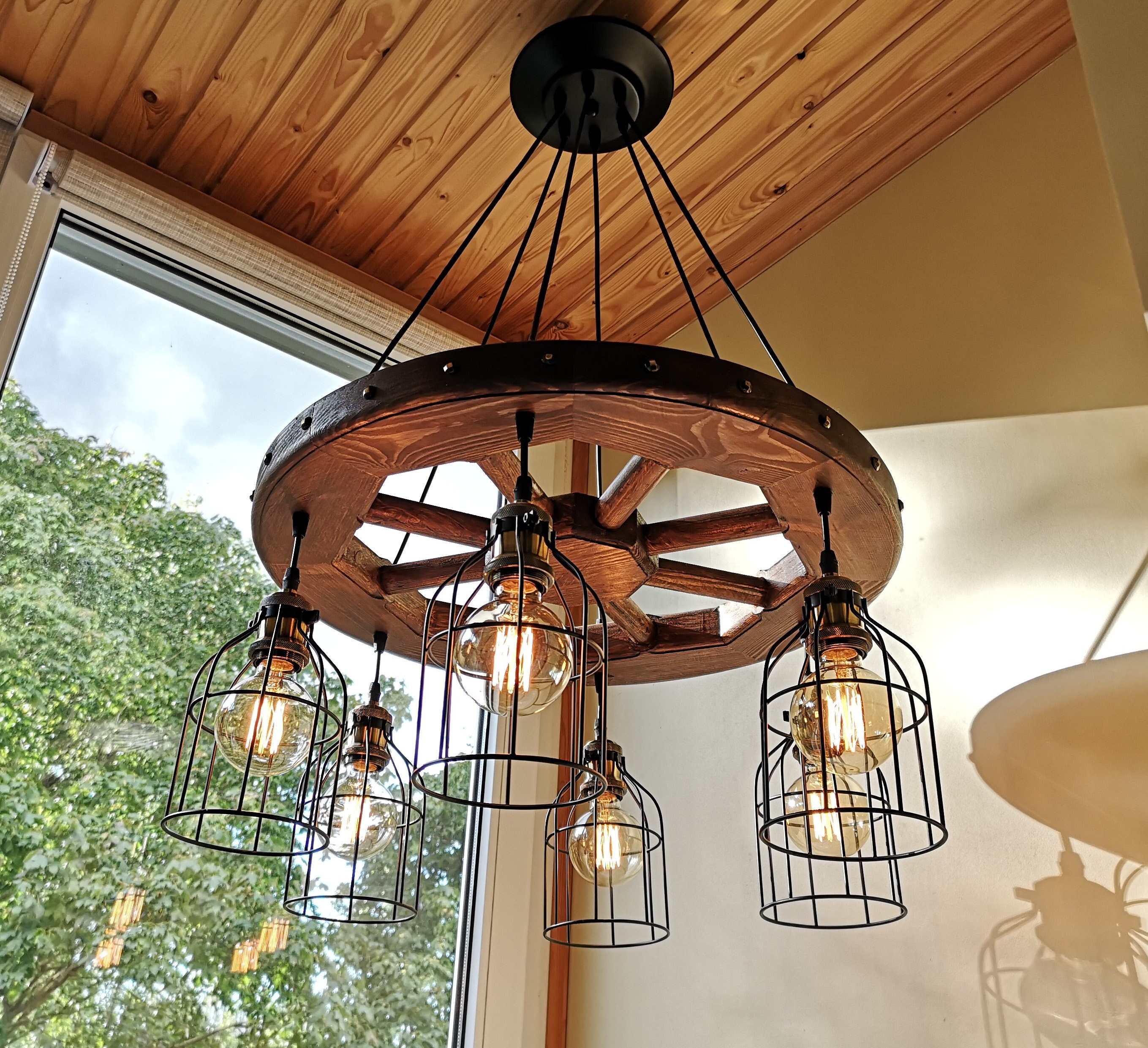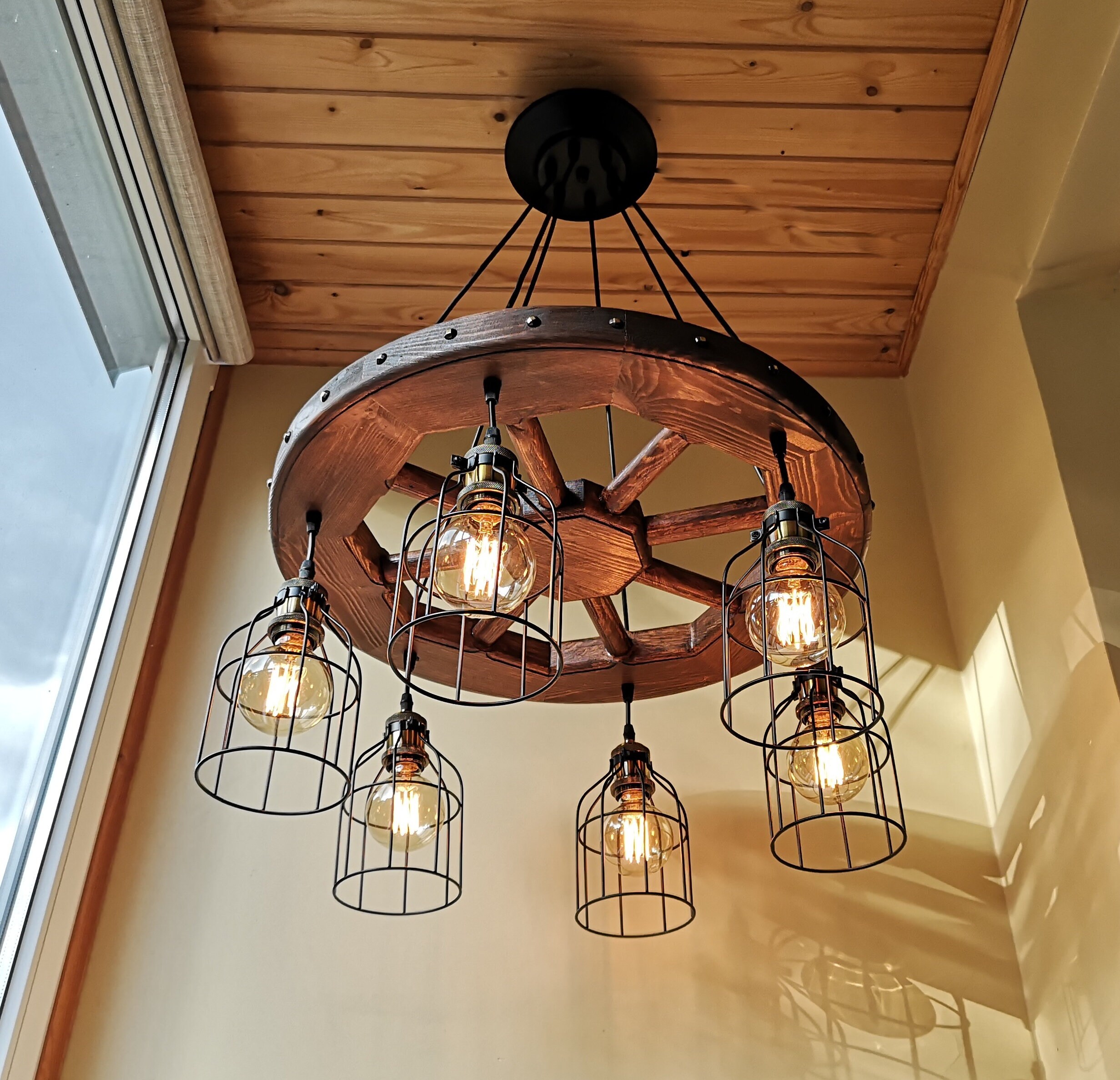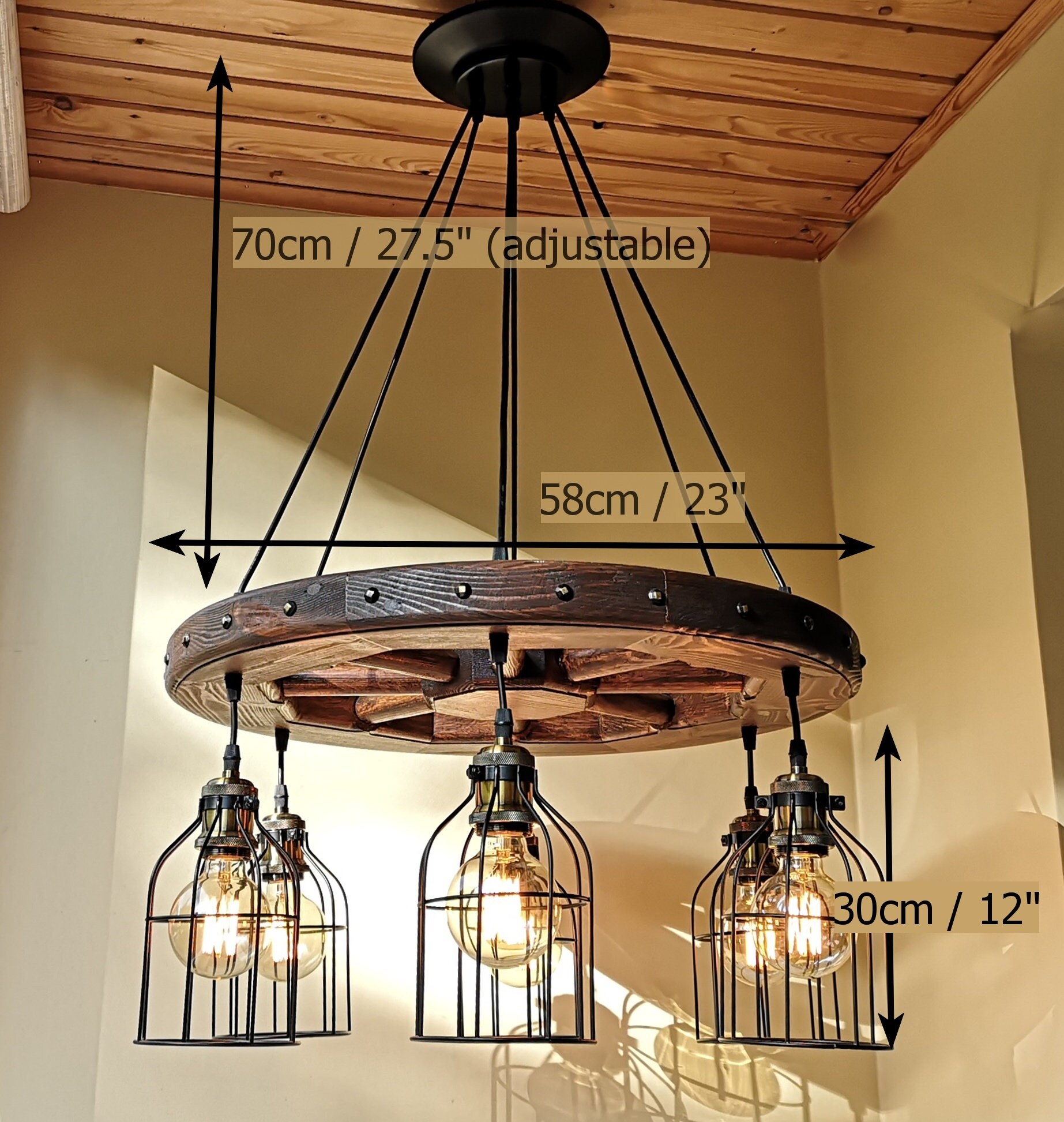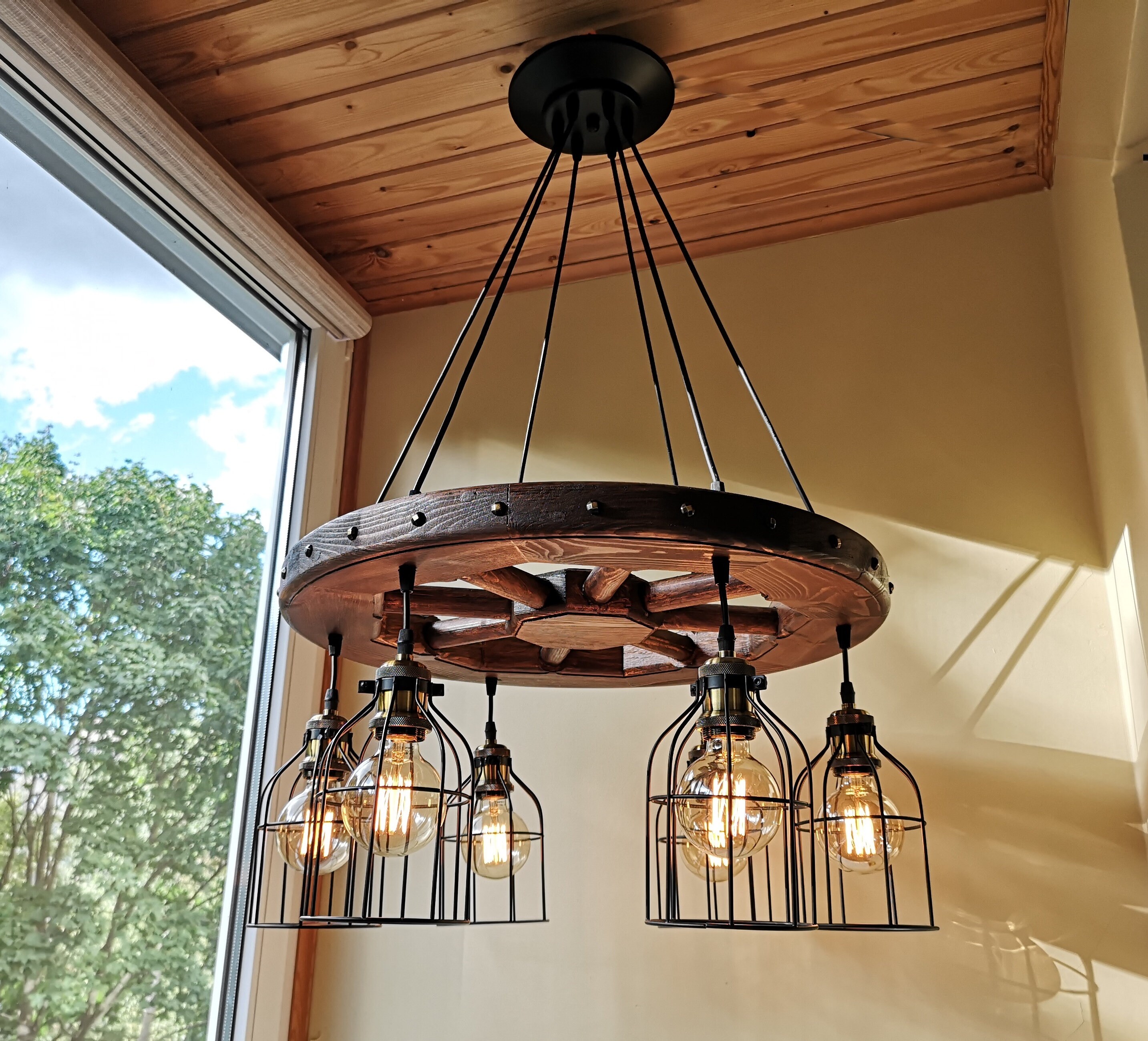 Wagon wheel chandelier - rustic lighting - rustic light fixture - wood ceiling light - dining room lighting - rustic chandelier lighting